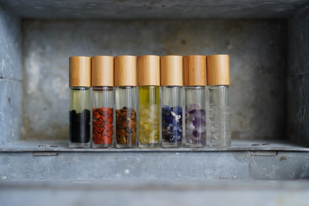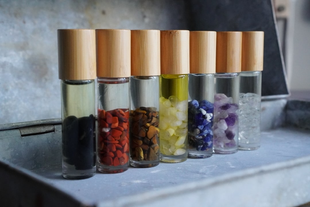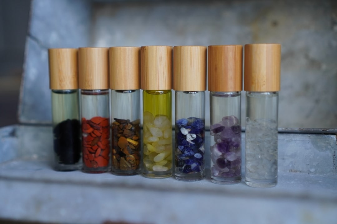 Chakra Oil Set. Root: Vetiver Sacral: Ylang Ylang Solar Plexus: Rosemary + Lemon Heart: Bergamot Throat: Lavendar Third Eye: Frankincense Crown: Pine + Peppermint Bonus Roller: Stress Away